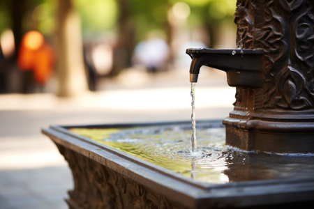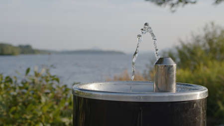 Drinking water fountain in park on urban background, no person. Close up of flowing water. Thirst and drought concept