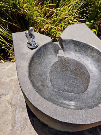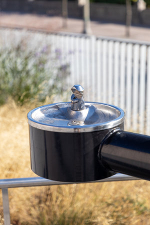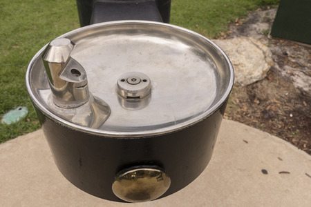 Water drinking fountain in public area. Close-up view of dry closed drinking fountain. Aluminum dirty sink and chrome faucet with button to open water in public park. Free drinking water fountain