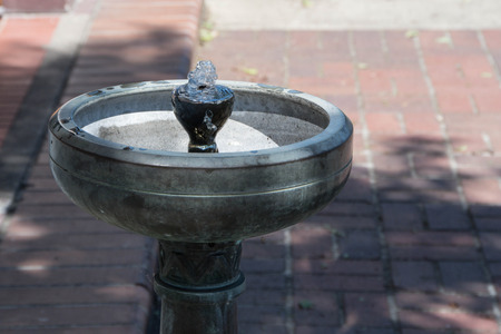 Human and dog water fountain outside near the fence railings and bushes- Miami, Florida. Blue water fountain on a concrete pavement outdoors.