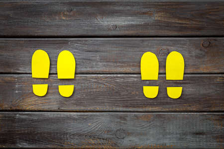 Delft, The Netherlands, June 13, 2020: footsteps drawn on pavement bricks to regulate pedestrian flows as a measure against spreading of covid-19