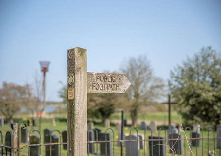 A wooden arrow sign post with Public Footpath on it and graveyard in background.