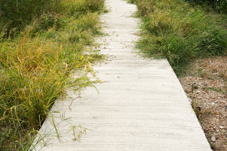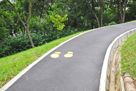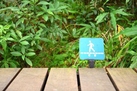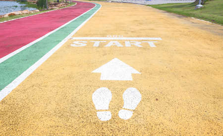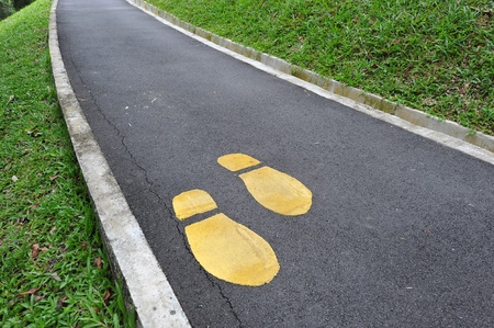 Close up white painting walking sign or icon on green lane with white lines on side of road in park.