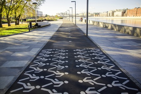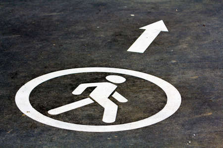 Marking the footpath. Pedestrian path with directions. Sidewalk for pedestrians. Demarcation line. Permission to move people. Signs drawn on the pavement.