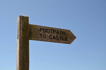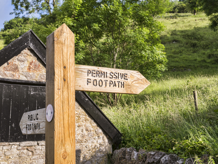 Closeup of a public footpath sign taken with a shallow depth of field, pointing across a green field with a person looking over a stone wall built through the field in Devon, UK.