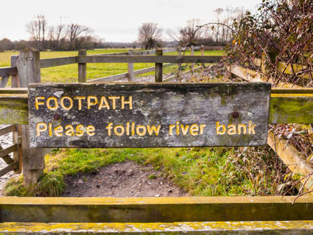 footpath please follow river bank yellow painted engraved wooden fence sign close up; essex; england; uk