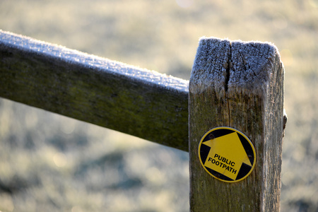 Close up view of a public footpath sign in Surrey, UK. The fingerpost points to a muddy path crossing a field to trees in the distance under a cloudy sky, taken with a shallow depth of field.