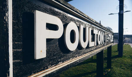 poulton le fylde, england, 05/05/2019 Poulton le fylde railway station sign at the train station in the small Lancashire village. Wooden hand carved type signage in small villages across the uk. Travel and commuting signage.