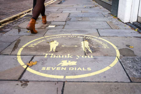 LONDON - NOVEMBER 3, 2020: A woman's legs walk past a yellow Covid 19 social distancing sign painted on the pavement in Covent Garden