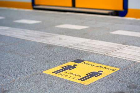 Coronavirus measures on platform railway station in the Netherlands. Yellow sticker signage calling for keeping five tiles distance for covid-19 coronavirus prevention. Train in background.