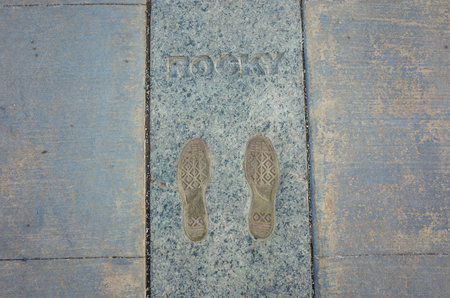 PHILADELPHIA - FEB 27: The Rocky Steps in Philadelphia, USA, on February 27,2014 The bronze inlay of sneaker footprints with the name Rocky stands right outside the Phialdelphia Museum of Art