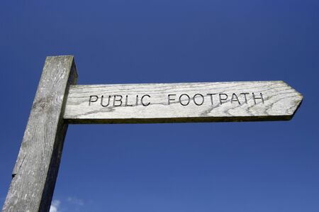 A double public footpath sign pointing in opposite directions on a wooden post with blue sky and clouds in the background.