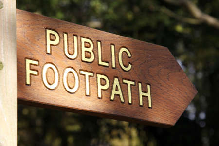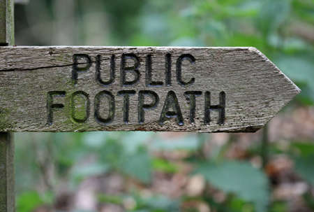 Routed wooden rustic public footpath fingerboard sign pointing to the right and attached to a post with letters inlaid in black and a blurred background.