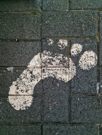 White footprints painted on dark sidewalk tiles, guiding tourists along a path in iceland, creating a unique journey through urban exploration