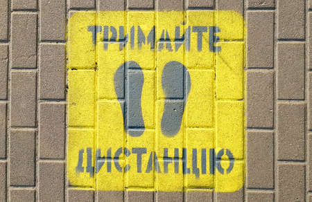 Ukraine, Kiev - April 23, 2020. Yellow sidewalk with the warning Keep your distance on the sidewalk. The text is in Ukrainian. Concept of maintaining social distance, quarantine or isolation.