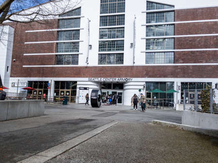 Seattle, WA USA - circa March 2022: People coming and going from the Seattle Center Armory Food and Event Hall on a bright, sunny day