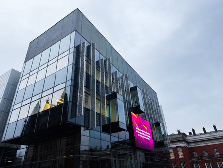 Manchester, UK - December 06, 2025: Contemporary glass facade in Manchester UK featuring reflective windows and bold digital signage against a gray sky.