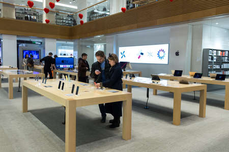 Russia, Moscow, March 07.2020: Kuznetsky Most. Luxury store TSUM. Sale of products to Apple.