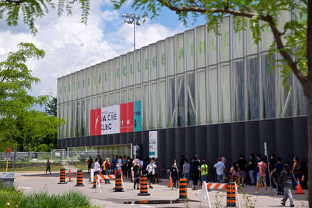 Toronto, Ontario, Canada - June 14, 2021: People line up at the entrance of covid-19 vaccine clinic in Toronto, Canada.