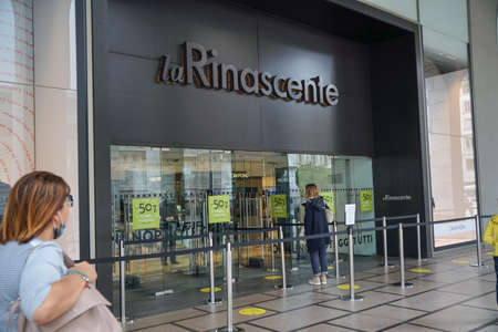 Milan - 6/17/2020: woman alone in line waiting to enter in a shop in Milan respecting signs of social distancing