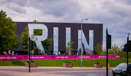 The word RUN in big mirrored letters outside The Copper Box arena in the Queen Elizabeth Park in Stratford, East London