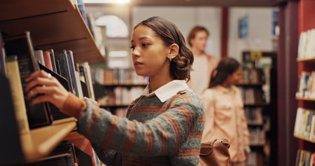 Woman, student and shelf with books in library for choice, textbook search and studying for exam. Female person, decision or literature information for knowledge, education and assessment at college