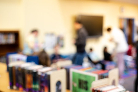 Bookcase and blurry abstract photo of parents and kids at elementary school library event near Dallas, Texas, America. Defocused students inside school class