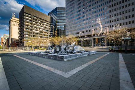 This image showcases a modern urban landscape featuring a reflective water pool amidst contemporary glass buildings, a striking visual of city life.