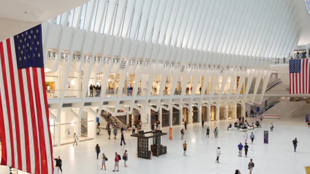 New York City, United States - 10 Sept 2023: World Trade Center Oculus transport hub architecture. Manhattan Downtown Financial District, USA urban life. People. September 11 remembrance american flag