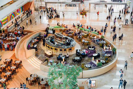 Dubai, UAE, United Arab Emirates - May 28, 2021: People visiting Dubai shopping mall. People going shopping in shopping center indoor. People sitting at tables in cafe on shopping center. People resting at modern shopping mall centre