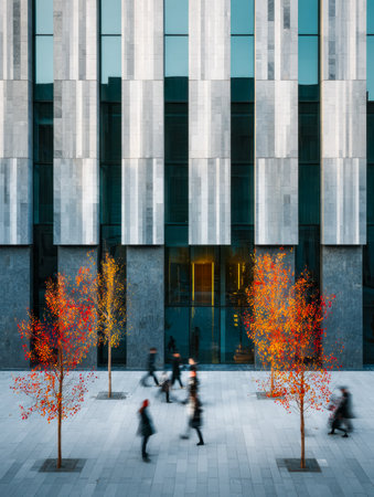 A bustling city street framed by sleek architecture and vibrant fall foliage, featuring pedestrians enjoying a lively, warm-season atmosphere amid urban elegance.