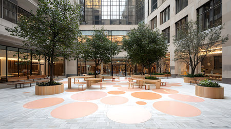 A serene urban garden scene featuring sleek concrete benches surrounded by flourishing greenery, offering a tranquil escape within a bustling city environment.