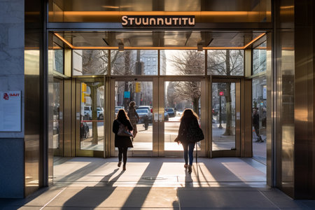 Dynamic scene in a modern glass walled atrium filled with people and sunlight reflections