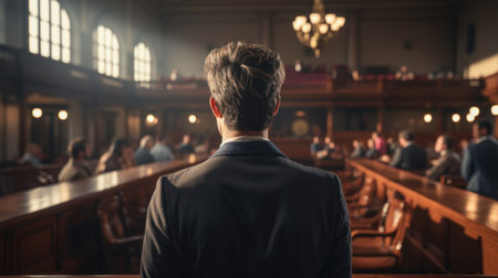 A lawyer confidently stands in a courtroom, embodying both professionalism and undeniable authority. Generative AI