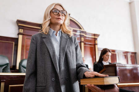 woman in eyeglasses giving swear on bible in court near prosecutor on blurred background