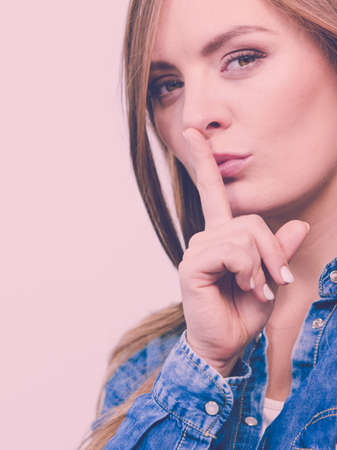 Fashion, people, jeans concept. Lady putting finger to the mouth. Girl is wearing denim shirt.