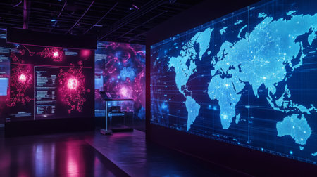 A large interactive digital map is prominently featured in contemporary technology exhibit