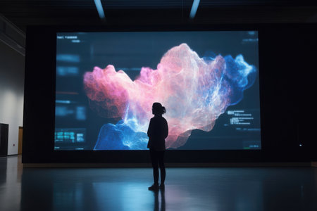 A person stands in front of a large, vibrant digital display featuring abstract visuals. The exhibition space is well-lit, emphasizing the creative technology on display.