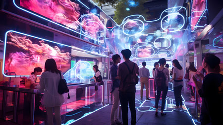 Abstract art exhibition with people under neon structures glow