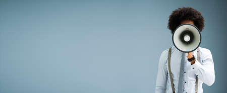 Cheerful man shouting, screaming through a megaphone, announcing something news, announcments concept