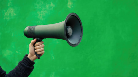 Megaphone in woman hands on a green background. copyspace.