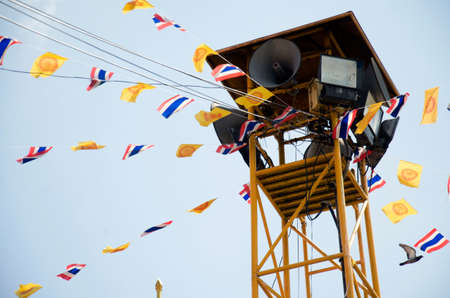 Megaphone for information wire broadcasting with motion of flag from wind of Wat Wachirathammasatit temple on February 19, 2017 in Bangkok, Thailand