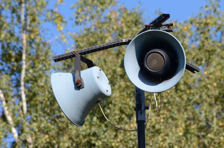 Old loudspeaker mounted on tripod broadcasting information