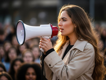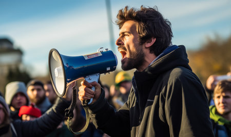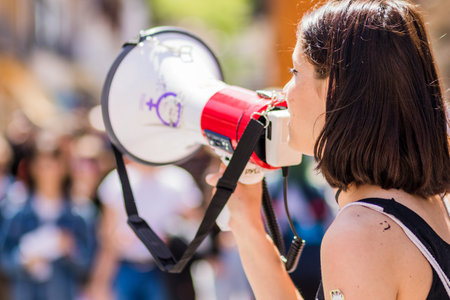 Young activist in a protest, shouting in a megaphone. Demonstration