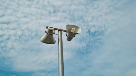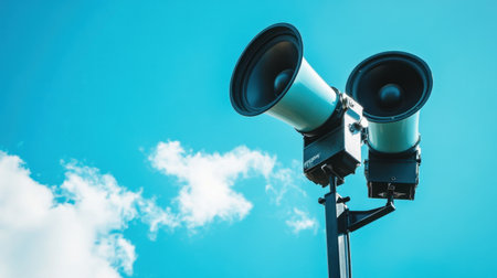 Outdoor loudspeakers with bright blue sky background