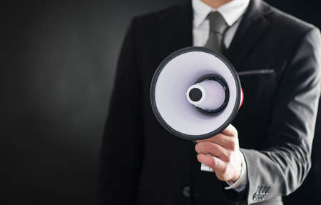 Close up of businessmans hand holding megaphone over dark background