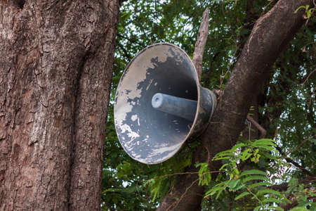 Vintage hornspeakers on a dry tree. Horn speaker.