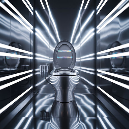 Modern sci-fi bathroom with futuristic toilet bowl, neon lights