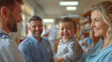 In a warmly lit hospital room, a joyful mother holds her infant son, with a smiling male doctor present, showcasing a moment of happiness and care.