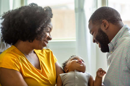 African american man with his cute daughter on knees sitting at cabinet with female caucasian doctor. Pediatrician with patients smiling and looking at camera. Health care concept.