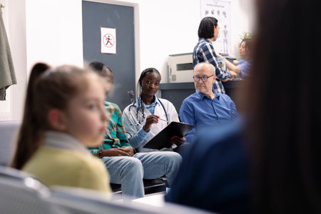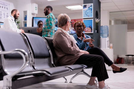 Diverse patients sitting in hospital reception waiting area, talking about medical appointment and healthcare. Senior patient and young woman waiting in facility lobby to start consultation.